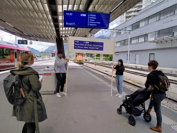 «Stell dir vor du wohnst in Landquart und willst mit dem Zug nach Davos…» So begann ein Auftrag an die Testpersonen, die für die Tests nach Landquart gereist waren. Während die Personen diese Aufgabe erfüllten, konnten wir beobachten, ob aufgrund der Prototypen nicht nur der richtige Zug, sondern eben auch der richtige Sektor gefunden wird. Andere Szenarien beinhalteten die Zugfahrt nach Klosters, bei der die Reisenden vermeintlich im falschen Abteil sassen oder das Einsteigen in Klosters, wo die Züge getrennt werden. Abgerundet wurden die Tests durch ein Interview, bei welchem wir mehr über das allgemeine Reiseverhalten erfahren wollten und dabei viele spannende Anekdoten hören durften. Beispielsweise hat uns eine Testperson erzählt, dass es in München bereits einen Flügelzubetrieb gibt und sie in der Hektik prompt im falschen Abteil eingestiegen war. So soll es den Fahrgästen im schönen Bündnerland zukünftig eben genau nicht ergehen.